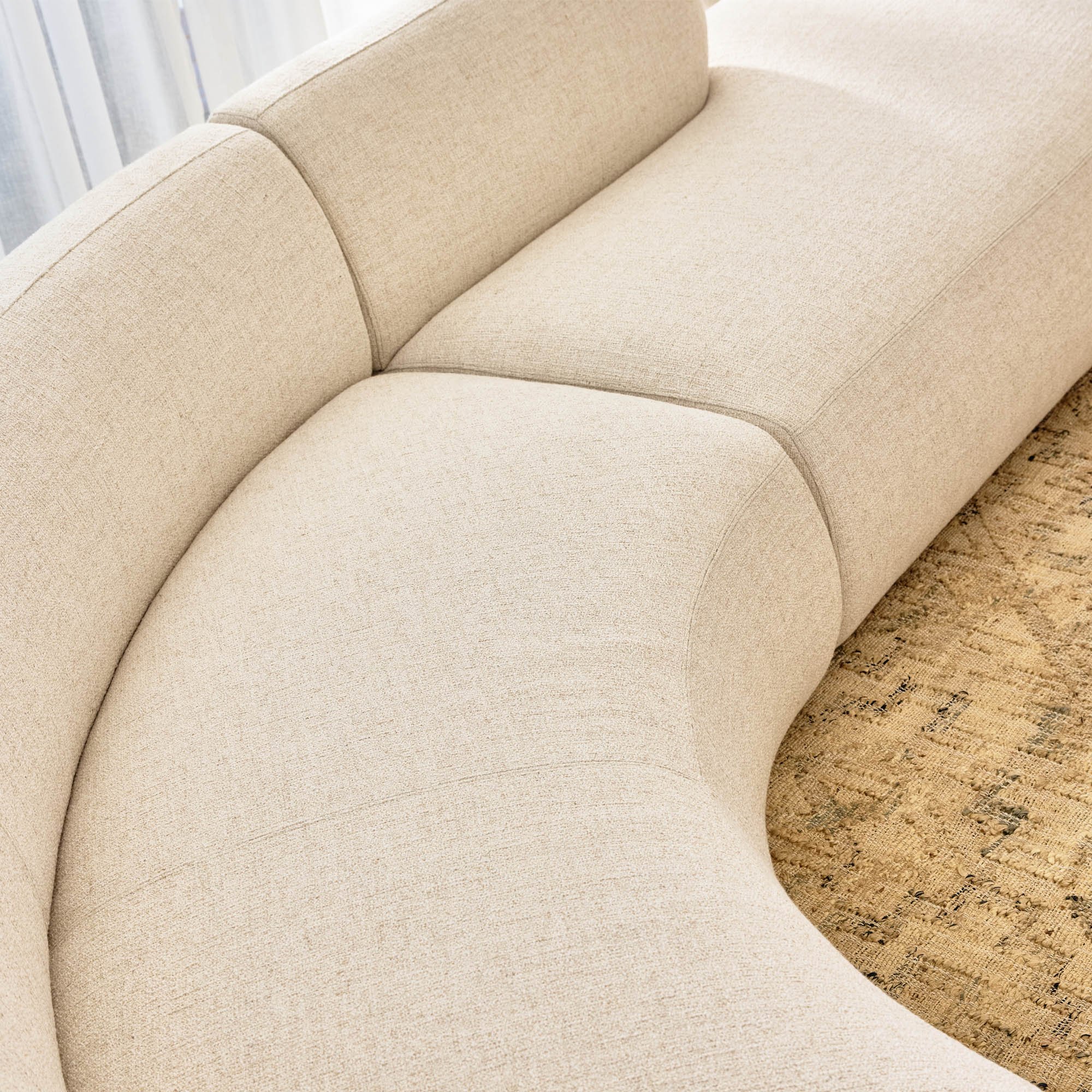 The Soho Modular Sofa is our biggest sofa yet! A sleek, modern marvel designed for both style and adaptability. This oversized sofa spans 4 meters in length but thanks to its simple joining system & connectors can be configured into two separate sofas, one straight & one curved. Its relaxed, curvaceous shape with bold, eye-catching design adds a touch of modern elegance to any space. Fully upholstered in a luxurious wool cotton blend, it complements both modern and traditional interiors effortlessly. With a medium-firm loungability level, this sofa is perfect for dividing large or open-plan living areas, providing both comfort and style for lounging and living. Experience the ultimate in style, versatility, & relaxation with the Soho Modular Sofa.